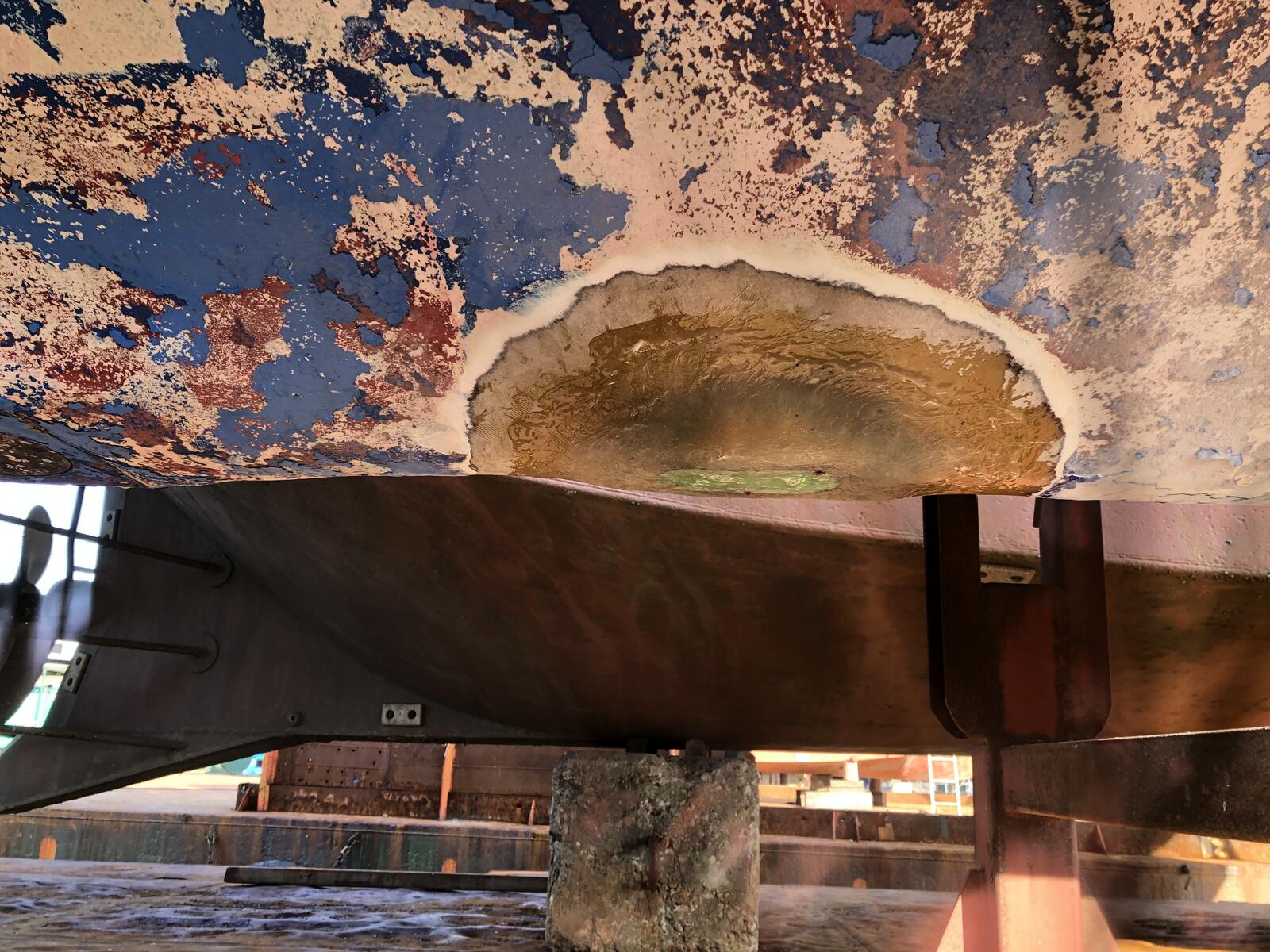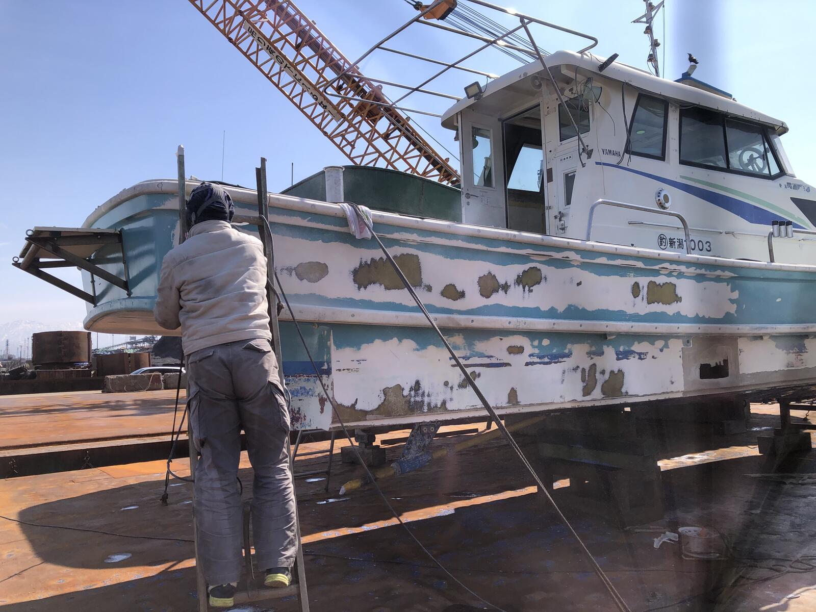 S造船さんがFRPの修理中です。職人さんが始めれば上手いし早くおわってしまいます。
