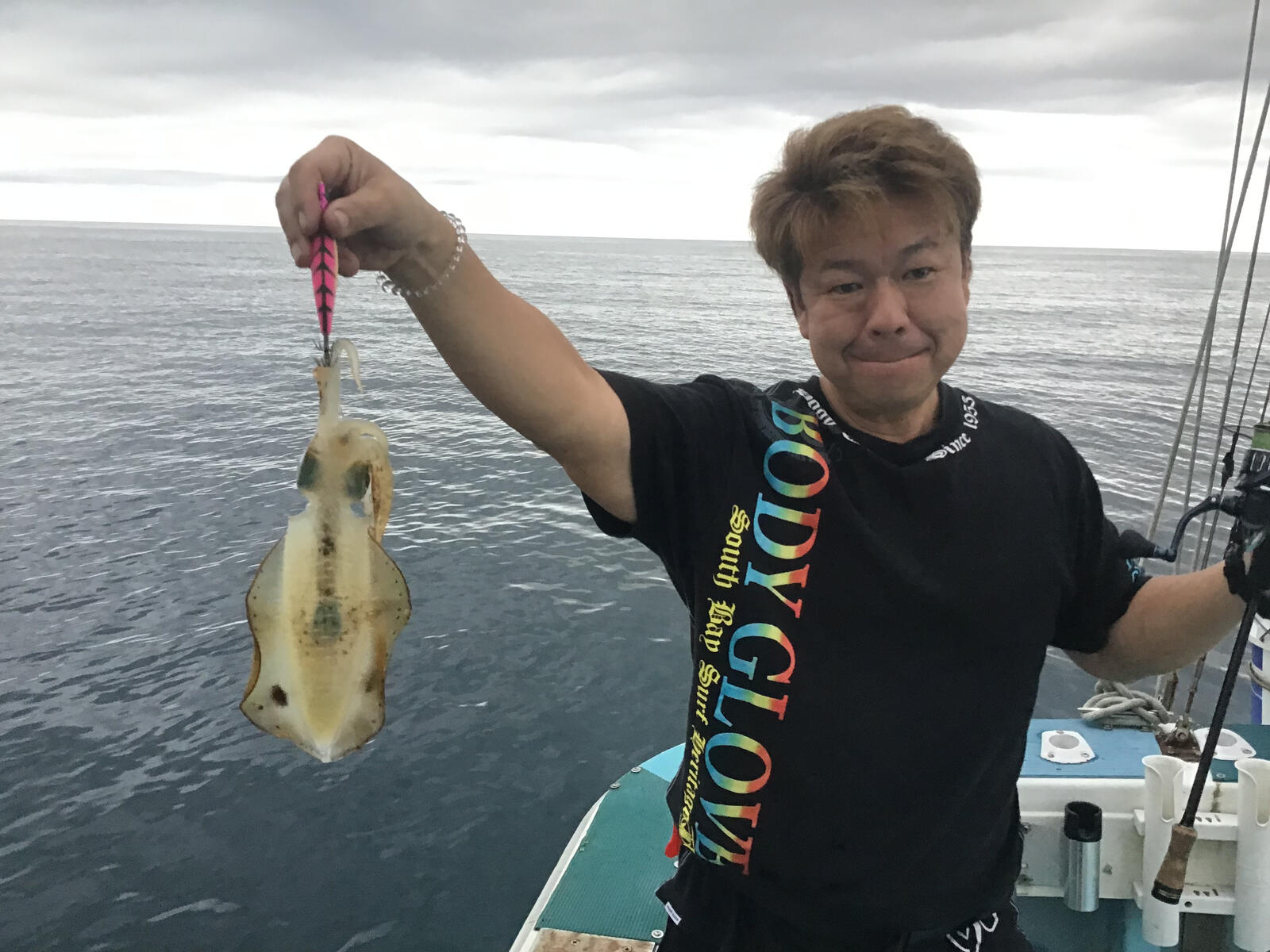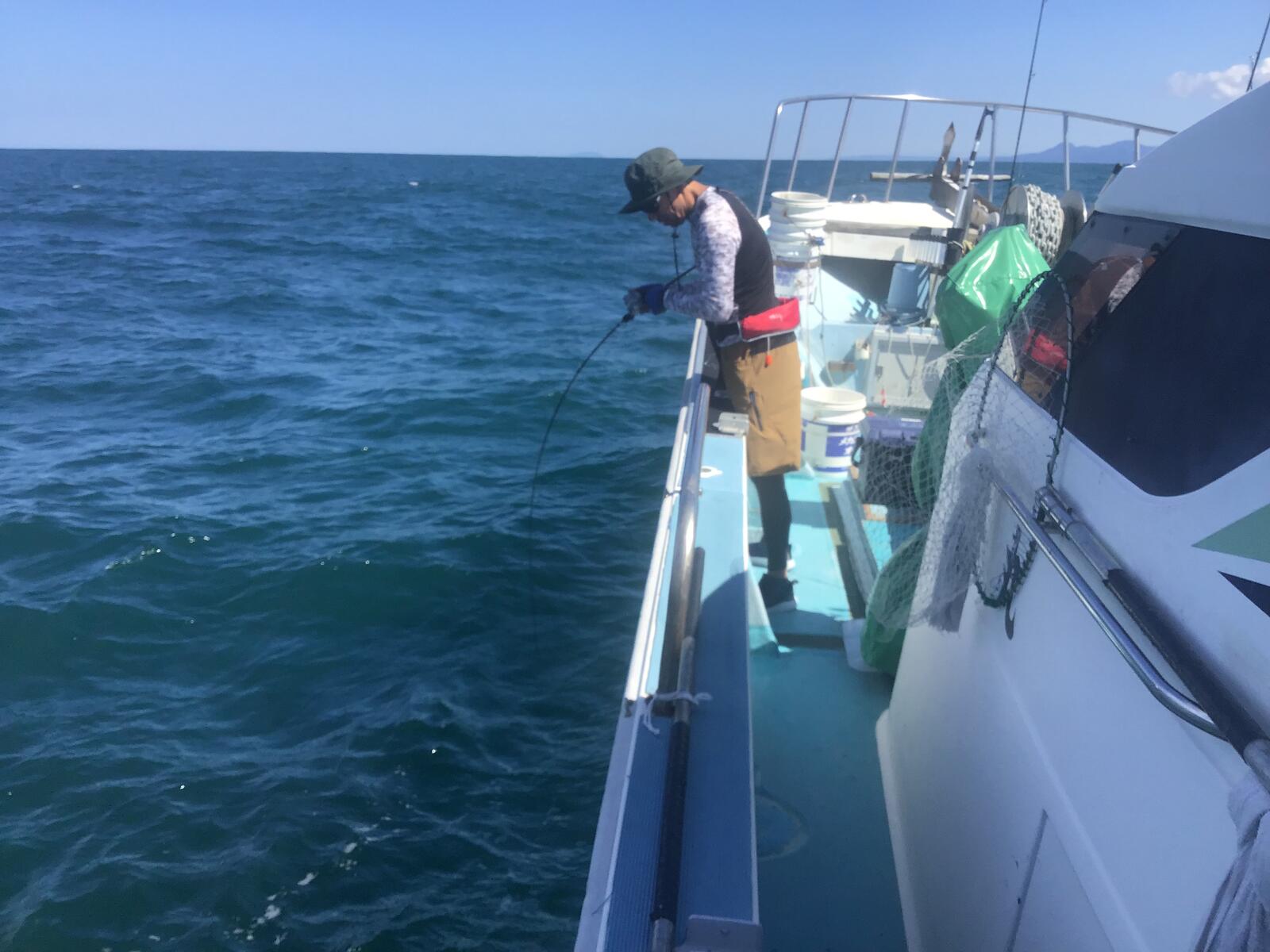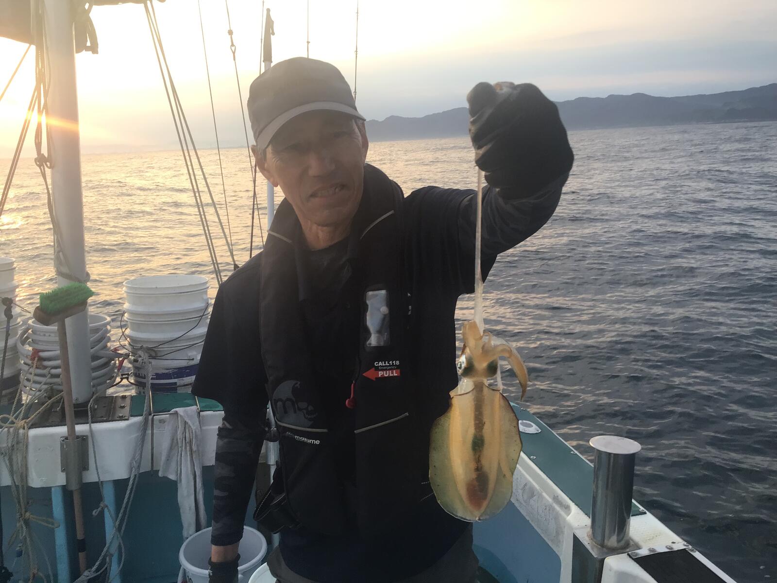 アオリイカは朝イチでやって見ました。海面付近に群れでウヨウヨと泳いでいました。上手く誘うとギュッと抱きついて来ますが、まだ型が小さくて食いつきは悪いです。