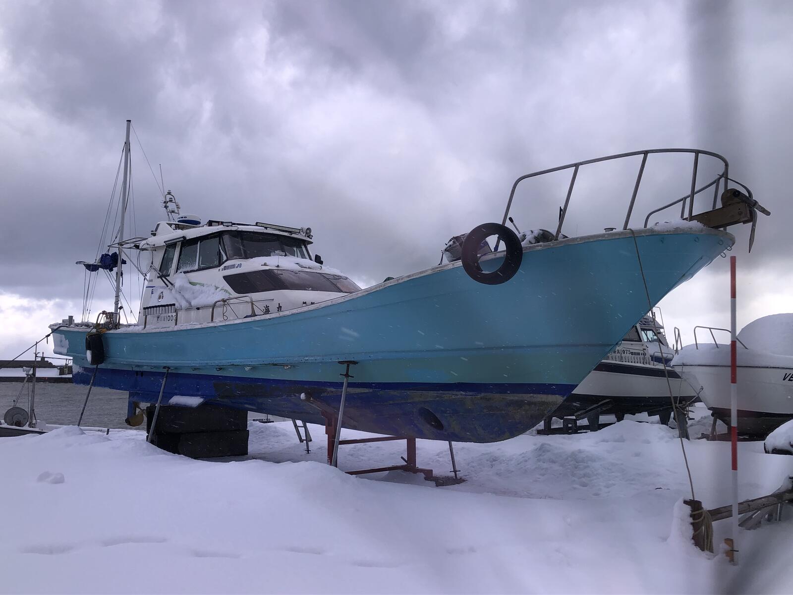 上架して船底清掃を始めたのですが、雪の為、中途半端でストップしています。天気が回復したら再開したいのですが今回の冬型気圧配置はしつこいです。