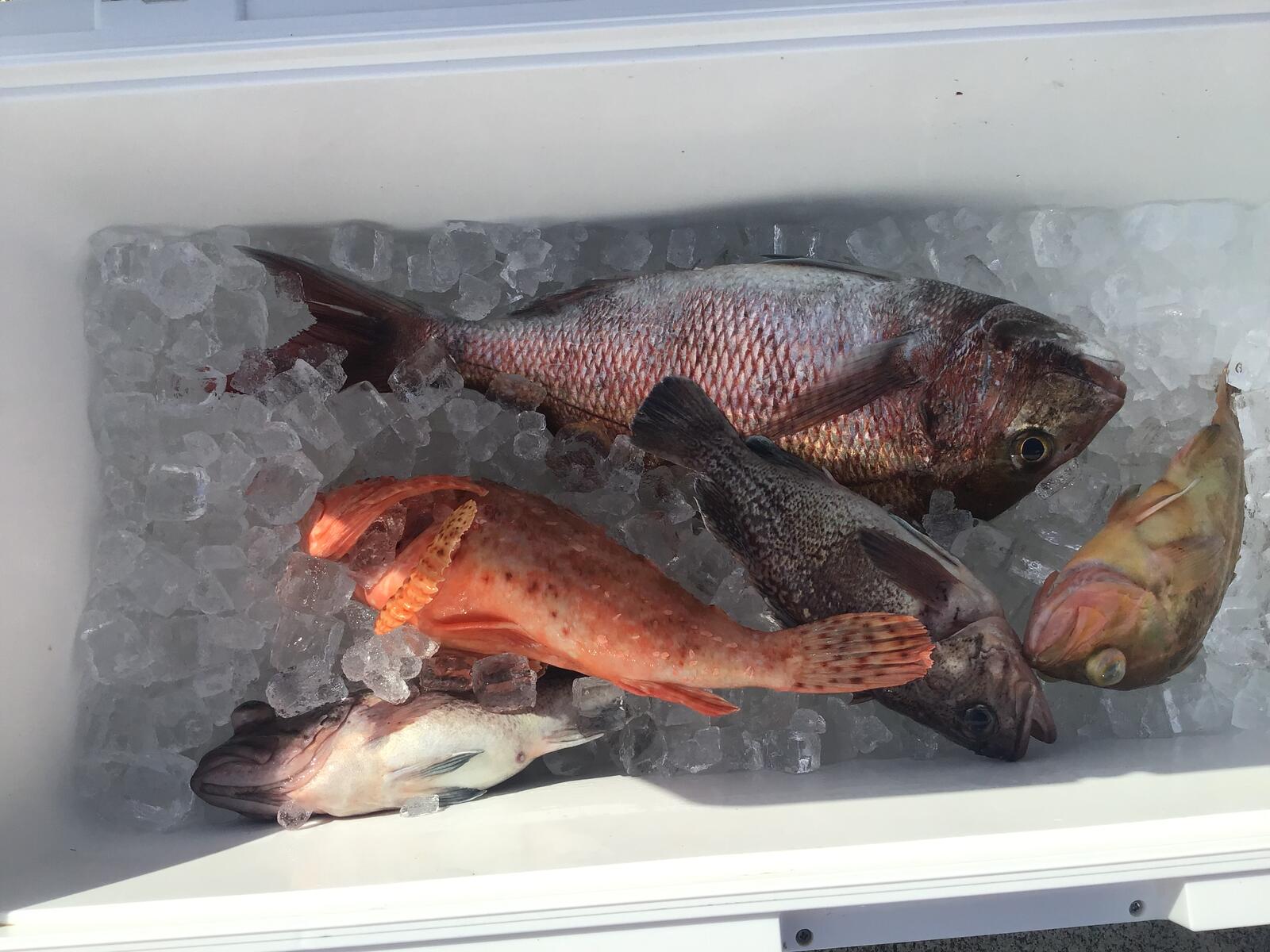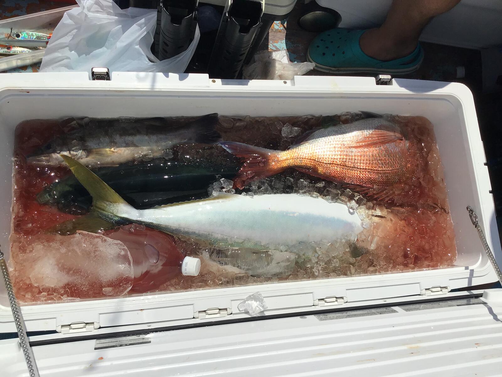 同氏のクーラーボックスです。アラ4尾にワラサにブリにマダイ キダイ メバルです。良く釣れました。